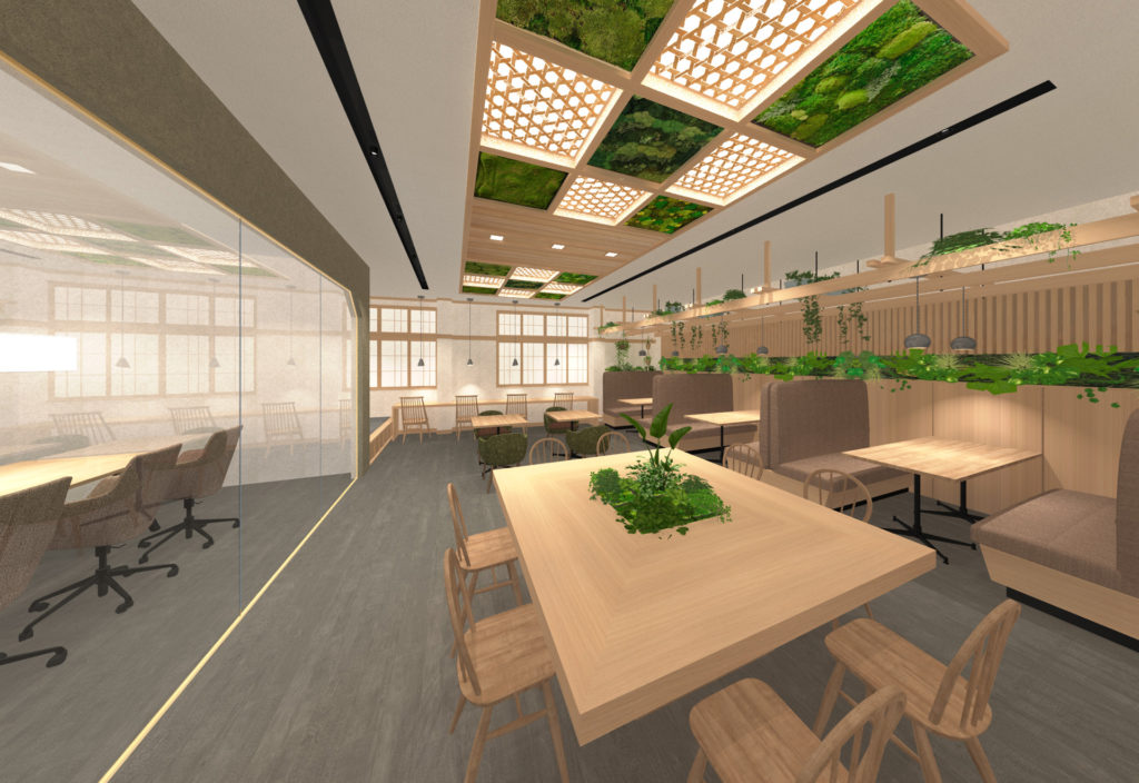 「和」を感じられるワークスペースの提案。漆喰や木材など自然素材を用いたり、植物を散りばめることでストレスの緩和を図った空間。