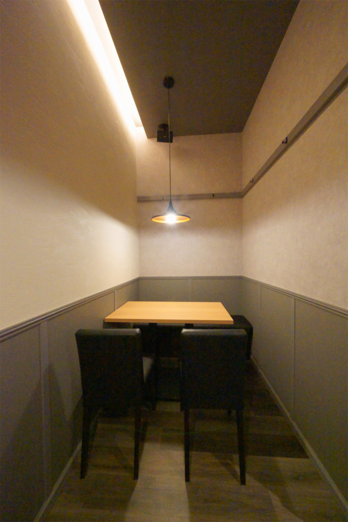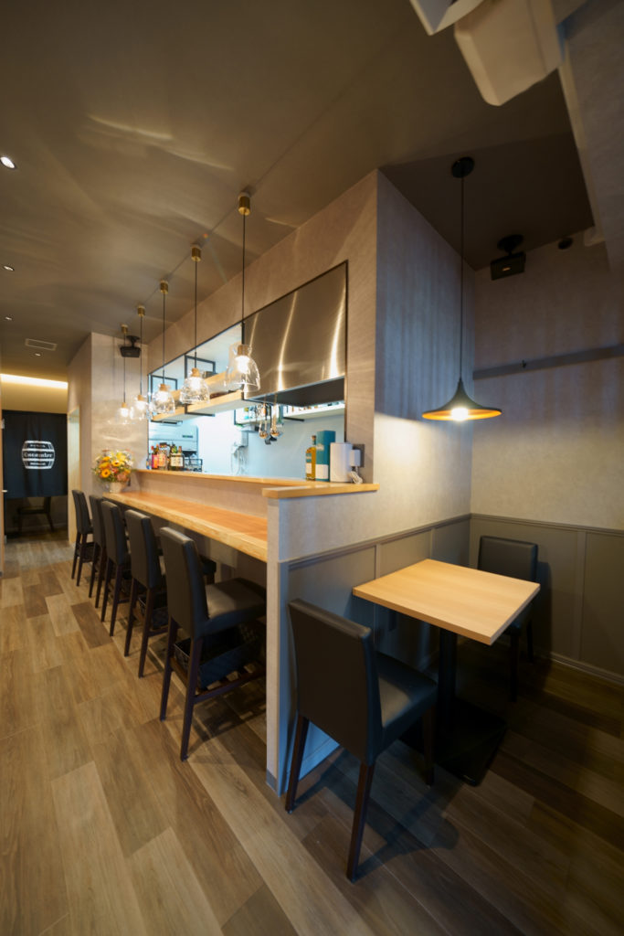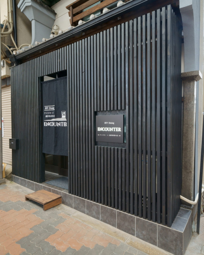 ウイスキーと創作料理をゆったりと味わえるお店。黒の格子で覆ったファサードは適度な抜けで圧迫感をなくしつつ、高級感を感じさせる印象に。中に入るとグレーと木を基調とした柔らかい雰囲気として、家具や暖簾を黒で統一し空間を引き締めつつ外観とのリンクを表現。
